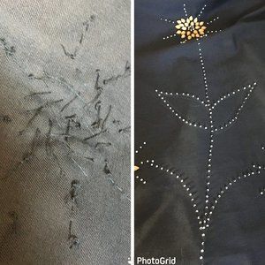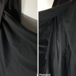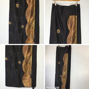 Vintage black wrap maxi skirt with brown hand beaded embellishments. Not sure on dating. Hand beaded (you can see some of the guide lines) and metal bells. Skirt is wrap style with darting across the top for a perfect fit. I have never been able to figure out wrap skirts; I did not find a "hole" that the strap would go back through.