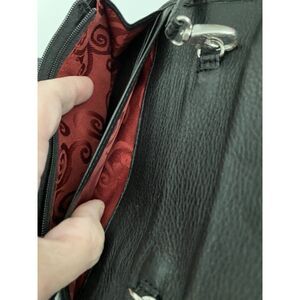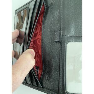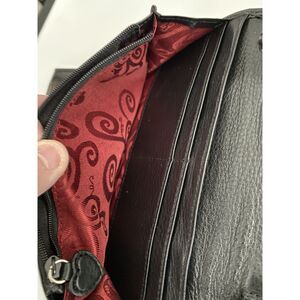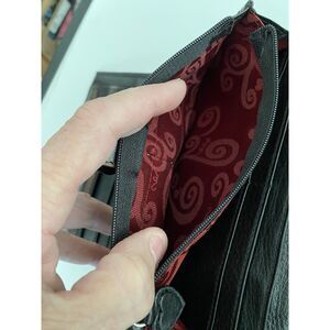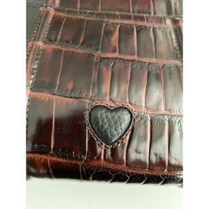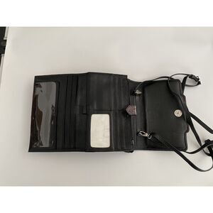Vintage Black and Brown Brighton Organizer Crossbody Shoulder Strap Purse Pre-Owned. Fold out design with multiple large pockets, card slots, ID holder, long adjustable crossbody strap and heart embellishments. No cracks, tears or marks. Measurements are 5"x8"x3" EUC