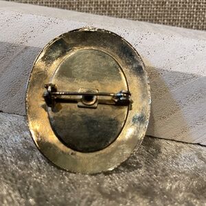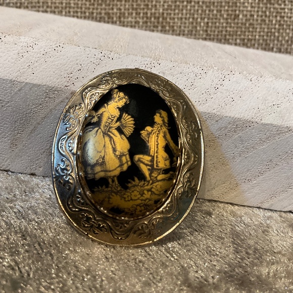 Vintage Black and Gold Courting Couple Brooch. Unmarked. Gold tone setting. Approximately 1-1/2" x 1-1/4". Setting is a black background with a colonial courting couple in gold. Good condition.