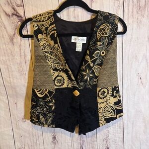 Vintage Black and Gold Patchwork Paisley Floral Patterned V-Neck Vest Small