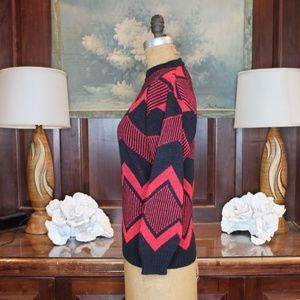 Red and black crew neck sweater with zig Zag and striped pattern, Sparkles through out.