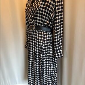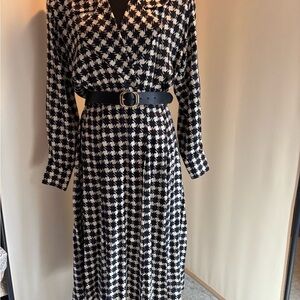 This chic black and white dress features a classic wrap design with a flattering V-neckline and a notched collar. The long cuffed sleeves add a touch of sophistication, making it perfect for both work and casual occasions. Its A-line silhouette and tie front detail offer a comfortable and stylish fit.