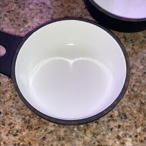 Enhance your kitchen with the Black and White Cast Iron Mini Skillet/Ramikin Set. Perfect for serving individual portions with style.