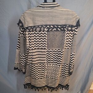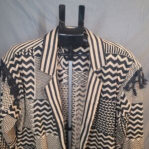 Vintage jacket with bold black and white patterns. Features a mix of geometric designs and black tassels. Very unique piece from Sam Hilu. 100% cotton.