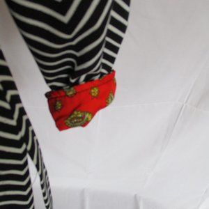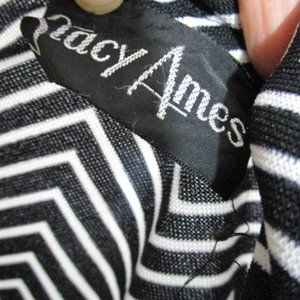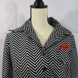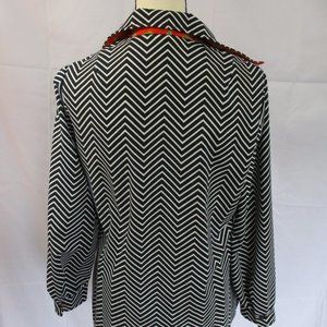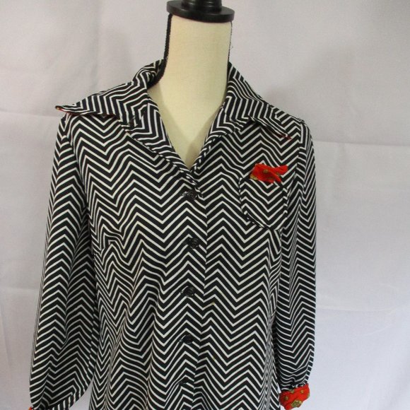 Vintage Stacy Ames Black and White Zip Zag Stripe Button Up Shirt. Polyester. Accent Red Design Fabric Cuff, Collar, Pocket. Garment about 16" arm inseam, 27" long from shoulder seam, 21" wide ... Medium.