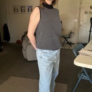 black and white checkered, sleeveless top, mock neck, fall fashion, winter wear, fitted, cropped, monochrome, casual, minimalist