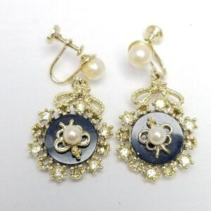 Vintage Black and Gold Tone Faux Pearl Dangle Clip On Earrings, Screw Backs