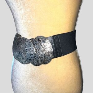 Vintage! Black elastic stretchy belt with tri silver ornate belt buckle!