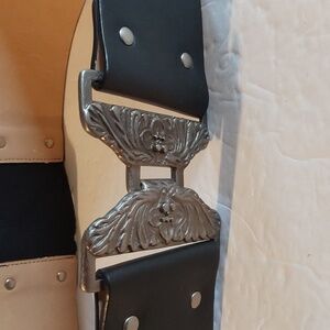 Vintage Black leather Heavy Metal silver Embossed CLASP Wide Belt Edgy Sz.L/XL