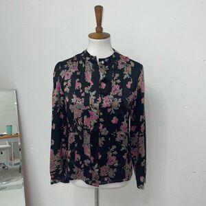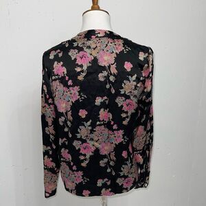 Vintage Black 100% silk pleated tailored floral button down blouse top medium 6