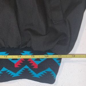 Cotton blend black snap down bomber jacket. Fully lined. Side pockets. Native Aztec print stretchy ribbed trim. Excellent condition. Unisex size Large.