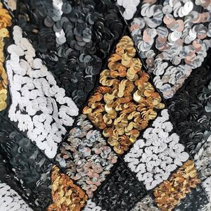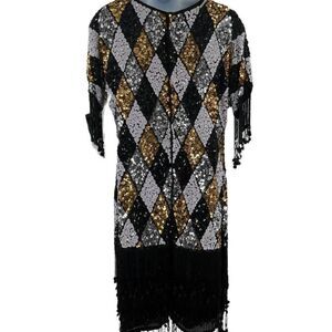 This striking vintage sequined dress showcases a glamorous black, gold, and silver harlequin diamond pattern, fully embellished with shimmering sequins for a dazzling effect. The dress is further enhanced with dramatic beaded fringe along the hemline and sleeves, each bead ending with a sequin for added sparkle. Perfect for festive events or parties, this dress is a true showstopper, exuding bold vintage charm and elegance.
