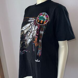 Beautiful sparkly metallic gold embellished Native American graphic Tee. 100% cotton made in the USA. Beautiful bold colorful graphics, native American feathers, beadwork, bison, spiritual, fringe graphics. Excellent vintage condition. New no tags. Size extra large.