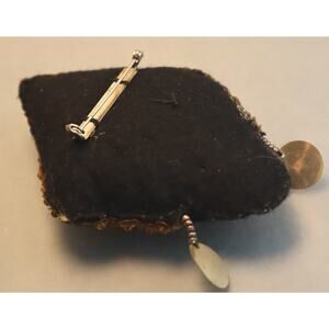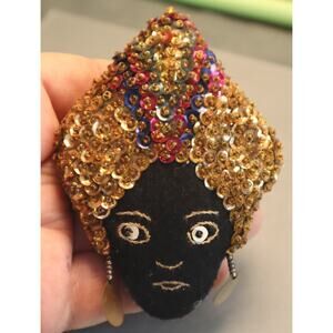 Fun vintage brooch depicts a woman in a sparkly sequin turban. She's black felt with hand painted features and dangling plastic and glass earrings. The pinback is stitched on and she's in nice vintage condition with a small spot of wear to the seam on her left side of chin. 3" x 3 3/4".