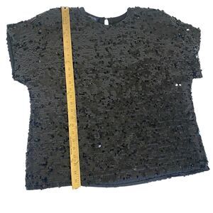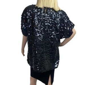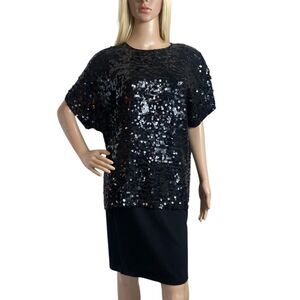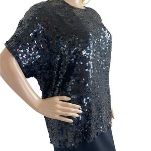 Shine in this stunning black sequin top. Perfect for a night out or special occasion. The sequins are sewn onto a silk the silk top . The shoulders are lightly padded and its excellent condition.,This was very well cared for and it’s clean and comes from a smoke free pet free home. it looks great with jeans as well as skirts and leggings.