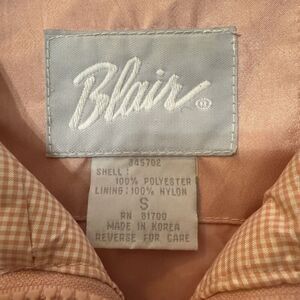 This vintage Blair rain coat windbreaker jacket is designed in a mid-length style with a pink shimmer color. It features a polyester outer shell and lining, making it lightweight and suitable for all seasons. The jacket has a full zip and snap closure, along with shoulder pads for added structure. With an oversized fit and pockets for convenience, this weatherproof jacket offers a classic city style for women in size small.