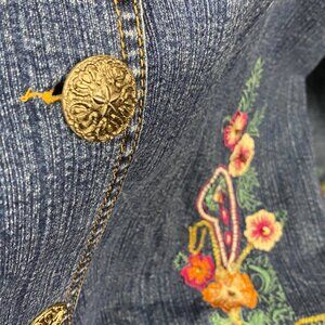Add a touch of vintage charm to your wardrobe with this Two Twenty Collection by Blair embroidered denim jacket. Crafted from a cotton blend with a hint of spandex for comfort, this women's medium blue jean jacket features intricate floral embroidery on the front, sleeves, and back. Designed with a button-up front, collared neckline, and long sleeves, this lightweight denim coat is perfect for layering. Whether you're embracing a boho-chic, western, or casual style, this piece adds a unique touch to any outfit.