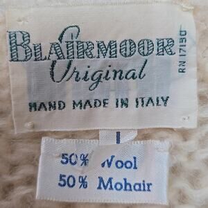 Vintage Blairmoore Wool/Mohair blend open front cardigan. Cream with 4 areas of floral embroidery, boxy cropped shape. Hand made in Italy. Very good preowned condition. Tag reads large, but this appears to run small so please see measurements below.