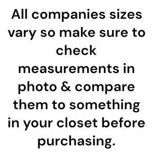 ALL COMPANY'S SIZES VARY SO MAKE SURE TO CHECK MEASUREMENTS IN PHOTO & COMPARE THEM TO SOMETHING IN YOUR CLOSET BEFORE PURCHASING.