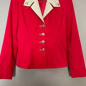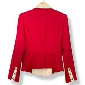 Vintage Entre Deux Modes by Carrie Rouveyrol red blazer with off-white collar and trim on cuffs. Large detailed buttons. Faux pockets. Colors may differ per screen settings.