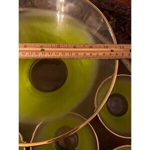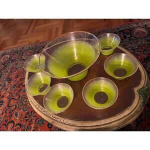 Large vintage chip/salad bowl from Anchor Hocking's Blendo collection with six 6 matching smaller glass bowls. Items are frosted lime green glass with gold around rims. All pieces are in excellent condition with no chips or scratches.