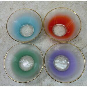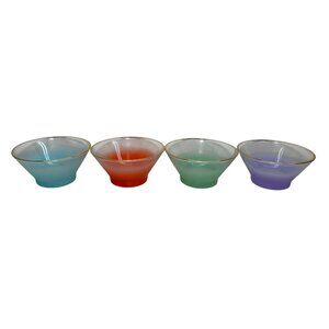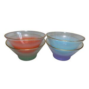 Add a touch of vintage elegance to your dining experience with this set of 4 Blendo ombre frosted salad bowls in blue, orange, green, and purple. Perfect for serving or as a collectible display.
