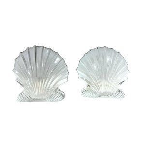 Vintage Blenko Art Glass Clear Scallop Clam Shell Bookends- Set of 2