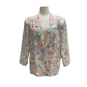 This vintage Block Island Petite floral blazer in size 14 is the perfect blend of elegance and comfort. Featuring a soft pastel hydrangea print in shades of pink, blue, and green, this lightweight jacket is ideal for spring and summer occasions. The single-button closure and structured fit give it a polished look, while the breathable fabric ensures comfort throughout the day. With its timeless design and versatile style, this blazer can be paired with trousers for work or styled with a dress for casual outings.