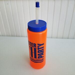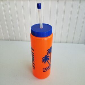 Neon Orange & Blue Vintage Blockbuster Beach Party Plastic Water Bottle & Straw. New/Unused from the 1980s or 1990s.