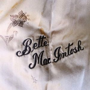 Vintage blonde mink coat from John Wanamaker Rittenhouse Shops of the Wanamaker building in downtown Philadelphia. Circa late 50s. Kept in excellent condition in dust bag in pet/smoke free home. Only imperfections are a few tan stains only on the inside lining beside monogram as shown in photos. Monogrammed "Bette MacIntosh". This piece is a luxurious blonde color with light brown shading. Lining is a beige silk with black floral print. Fabric wrapped eye/hook enclosure at collar. Trapeze style.