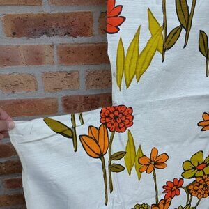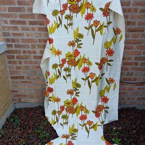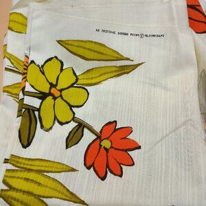 Vintage 1970s groovy mod floral screen print Bloomcraft interior fabric remnant. Measures 43.5" wide at the widest and approximately 80" long. Textured woven fabric suitable for interiors or vintage repro projects. Several sections have been cut out, fabric has been folded and has creases. Some fraying at the edges. No major stains or marks noted. Sold from a cigarette and pet hair free home but customer may notice a slightly musty odor due to previous storage conditions.