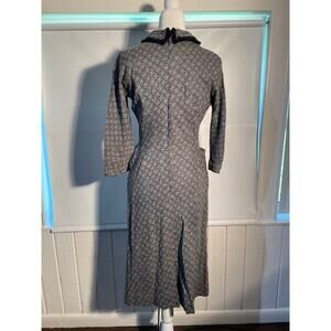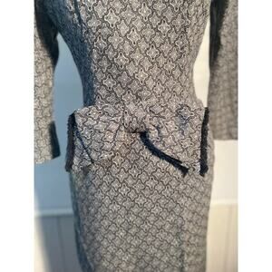 Beautiful vintage Bloomfield by Connie Chase dress circa 1950's. It has 3/4 sleeves, wool blend, fully lined, sheath dress. It has a bow at the waist and 2 front pockets.