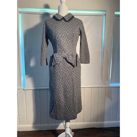 Beautiful vintage Bloomfield by Connie Chase dress circa 1950's. It has 3/4 sleeves, wool blend, fully lined, sheath dress. It has a bow at the waist and 2 front pockets.