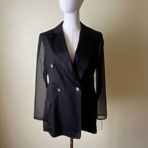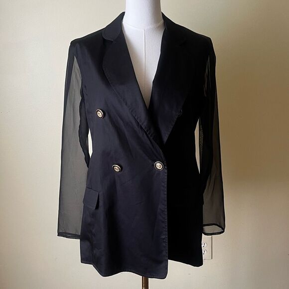 Vintage Bloomingdales Black Double Breasted Blazer Sheer Sleeves Gold Buttons 10