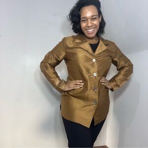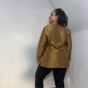 For fans of vintage blazer, bronze gold jacket, silk blazer, long line coat, luxurious outerwear, metallic fashion, evening wear, formal jacket, designer resale, Bloomingdale's vintage, gold silk clothing, lightweight blazer, glamorous coat, statement piece, 90s fashion
