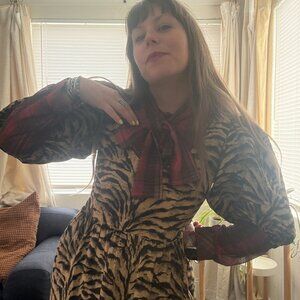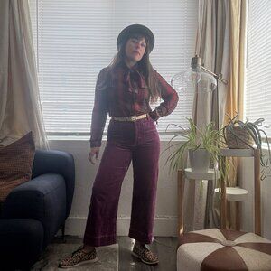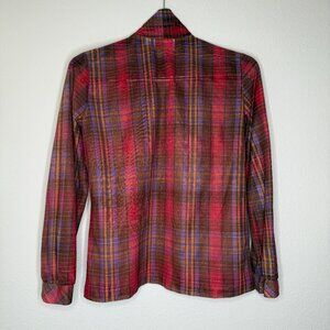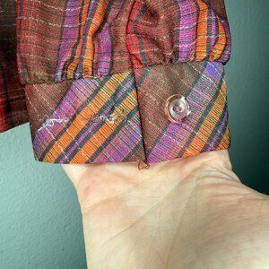 Details- This is a vintage 1970s era autumnal plaid button down secretary blouse by Miss Capri in red, orange, purple and brown. Has an attached bow at the neck and the buttons at the cuff can be made smaller or bigger depending on your wrist size. Semi-sheer.