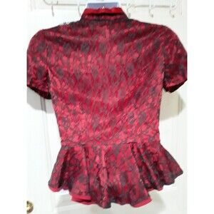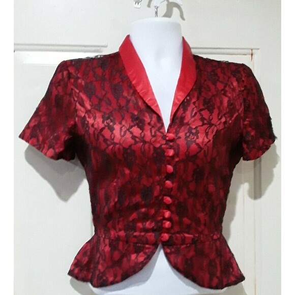 Vintage Jolie Madame Blouse/Top, Fitted Red Satin/ Black Lace, Goth, Steampunk. Excellent condition and quality. Approximately 21 inches shoulder to hem, 19 inches armpit to armpit 13 inches across at waist when buttoned. No rips stains or tears.