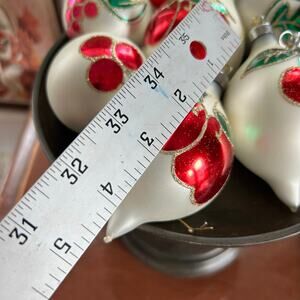 This set of 8 vintage blown glass ball ornaments features glittered fruit designs including apples, cherries, and grapes. The set includes both round and teardrop-shaped ornaments, each adorned with sparkling glitter to enhance the intricate fruit details. These vibrant ornaments add a charming, whimsical touch to your holiday decor, perfect for collectors or those seeking unique pieces for their Christmas tree or festive display.