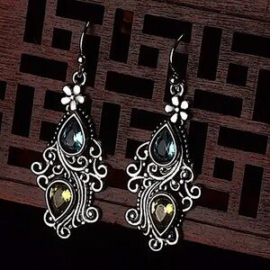 Vintage Blue Amber Crystal Earrings Silver Dangle Handmade