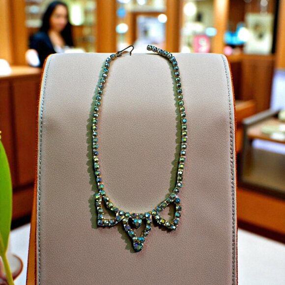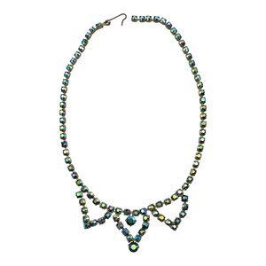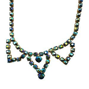 Vintage deep blue aurora borealis triple triangle necklace. Measures about 15" and can be adjusted smaller. Crystal rhinestones are prong set. Pre-owned estate jewelry in very good condition.