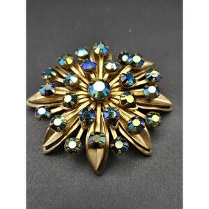 Vintage Blue Aurora Borialis Rhinestone Brooch Pin Goldtone