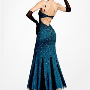 Y2K 2000s coquette fairy blue fit flared maxi prom dress. Sweetheart neckline. Spaghetti straps. Beaded throughout over a mesh overlay. Back zip and hook closure
