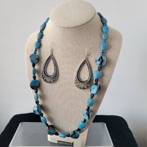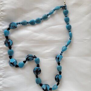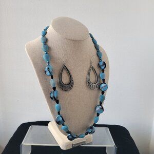 Vintage Blue Black Swirl Clay Beaded Necklace w/Boho Black Pierced Teardrop Earrings Set
