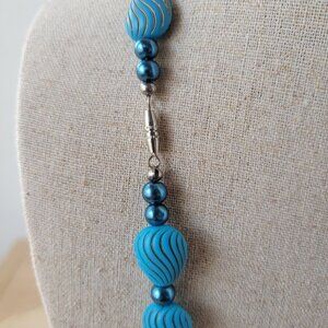 Vintage Blue Black Swirl Clay Beaded Necklace w/Boho Pierced Teardrop Earrings
