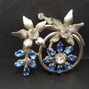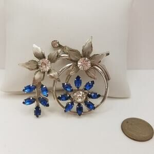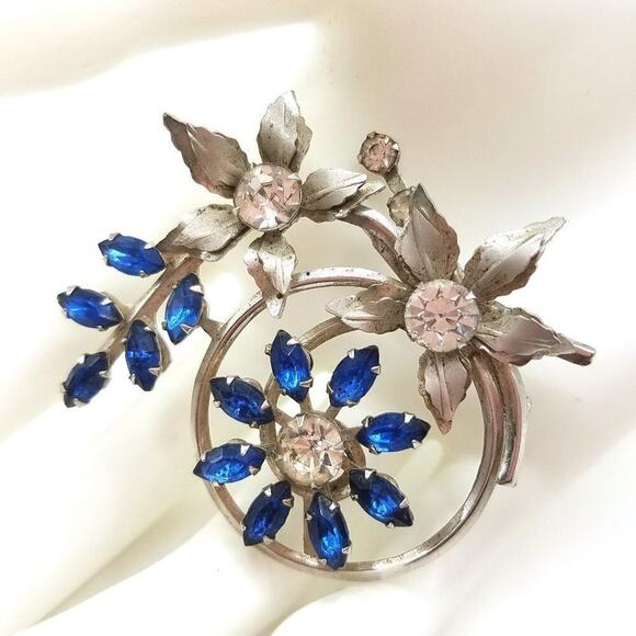 Vintage Blue Clear Glass Rhinestone Floral Brooch & Pendant, Riveted, 2 Inches