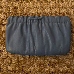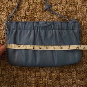 This elegant blue clutch bag is perfect for any occasion. Its sleek design and vibrant color make it a standout accessory. Gathered top pops open to a lined clutch. See the little blue bow designed like the strap. No tags but feels and look like leather.