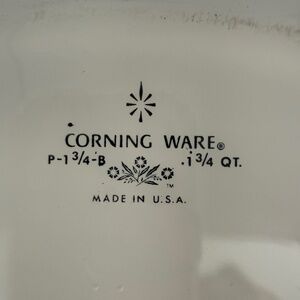 Bring back memories with this classic blue cornflower pattern. Corning ware made with pyroceram can go from freezer to oven, microwave to dishwasher. Don’t have the lid any longer. Used but has many many years still ahead of it. P-1 3/4-B
