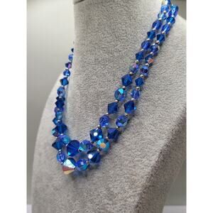 Beautiful vintage double strand necklace featuring brilliant cobalt blue crystal beads with aurora borealis shimmer.