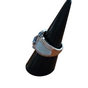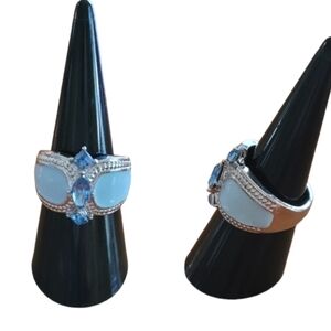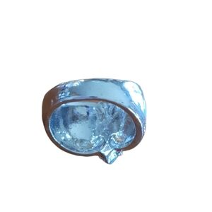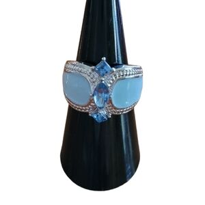 Excellent pre owned condition. Vintage Blue Crystal and Enamel Silver Plated Ring. Three center stones. Blue enamel sides. Silver plated.