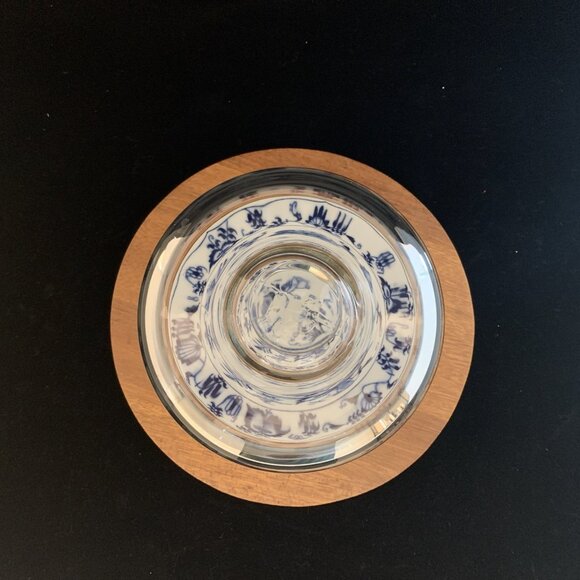 Blue Onion Pattern Cheese Plate w/Wooden Base and Clear Glass Dome